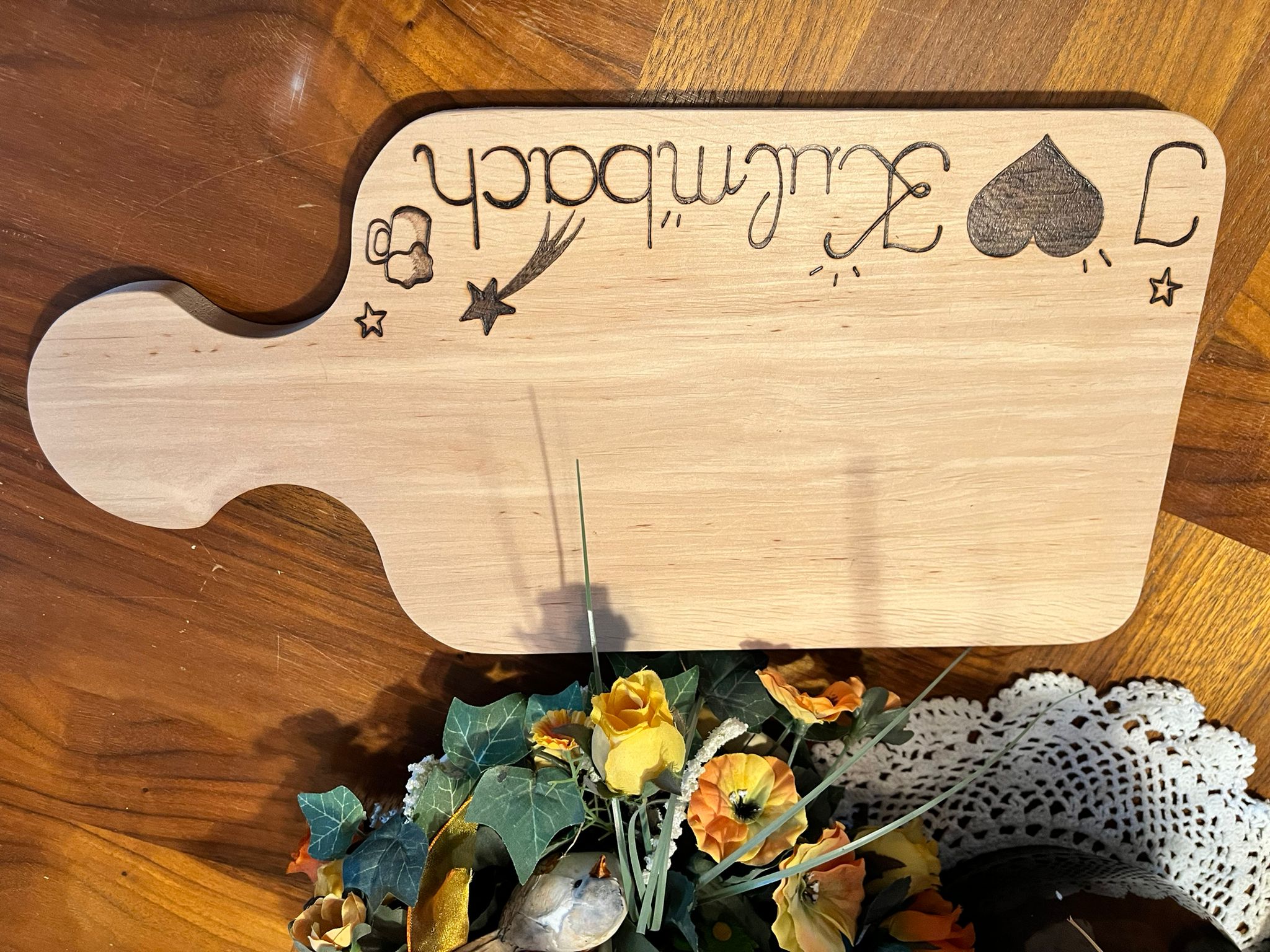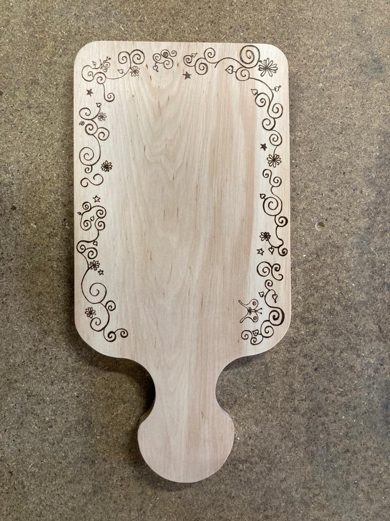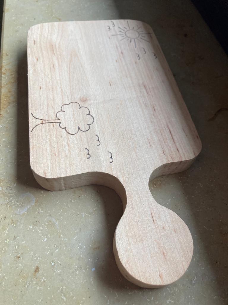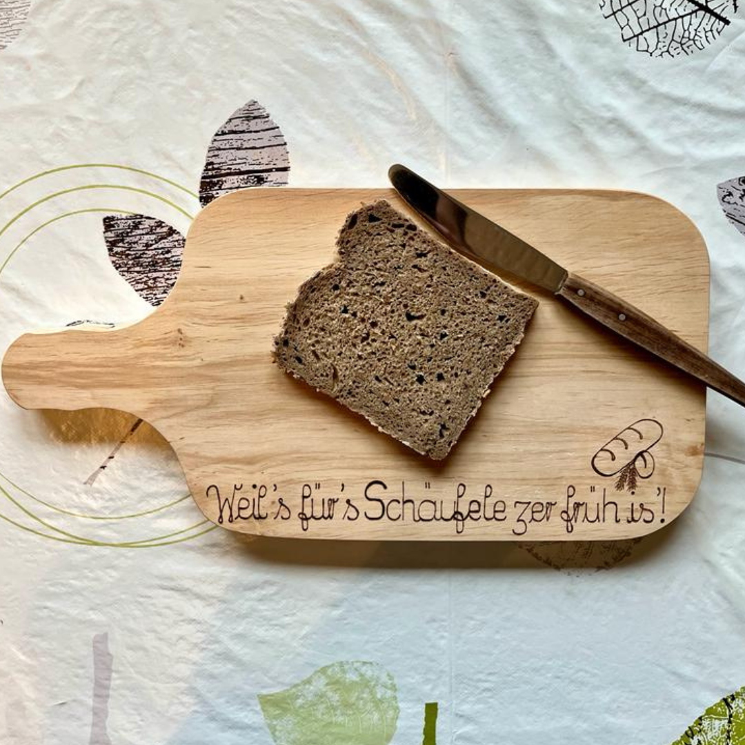 Das kleine, individuell angefertigte Brotzeitbrettchen ist perfekt für den Nachwuchs. So kann die gesamte Familie Brotzeit machen. Die verspielten Elemente wurden mit dem Lötkolben eingebrannt. ACHT ...