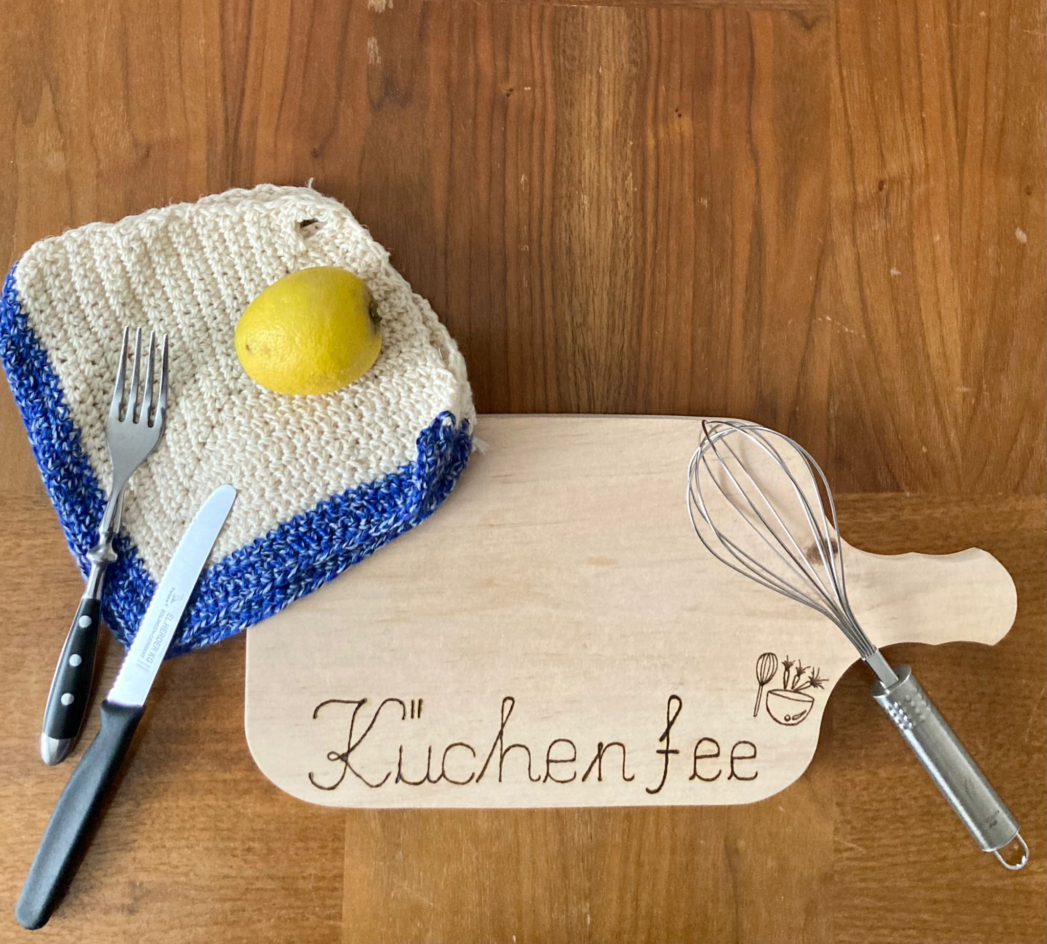 Das Brotzeitbrettchen ist eine tolle Geschenkidee für alle Küchenfeen. Als ergänzenden Gag gibt es eine kleine Häkelbeigabe mit. Die urigen Topflappen runden das Geschenk ab. Eine individuelle Anf ...