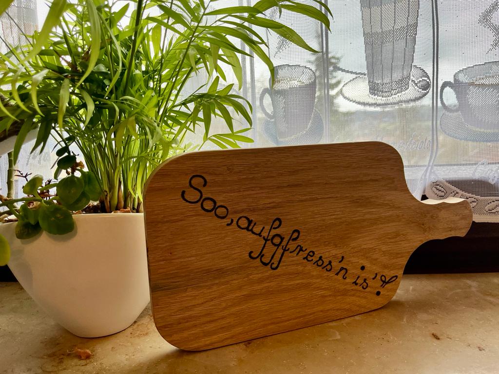 Ebenfalls eine lustige und zugleich sinnvolle Geschenkidee - das Brotzeitbrettchen mit dem frechen Spruch "Soo, aufgfress´n is´!" für alle Vielfraße unter uns. ...